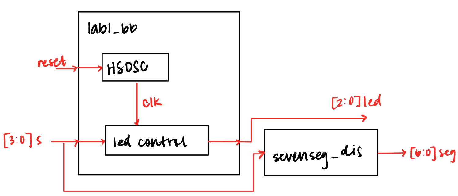 The block diagram in Figure 1 demonstrates the overall architecture of the design. The top-level module lab1_bb includes two submodules: the high-speed oscillator block (HSOSC) and the 7 segement display sevenseg_dis.