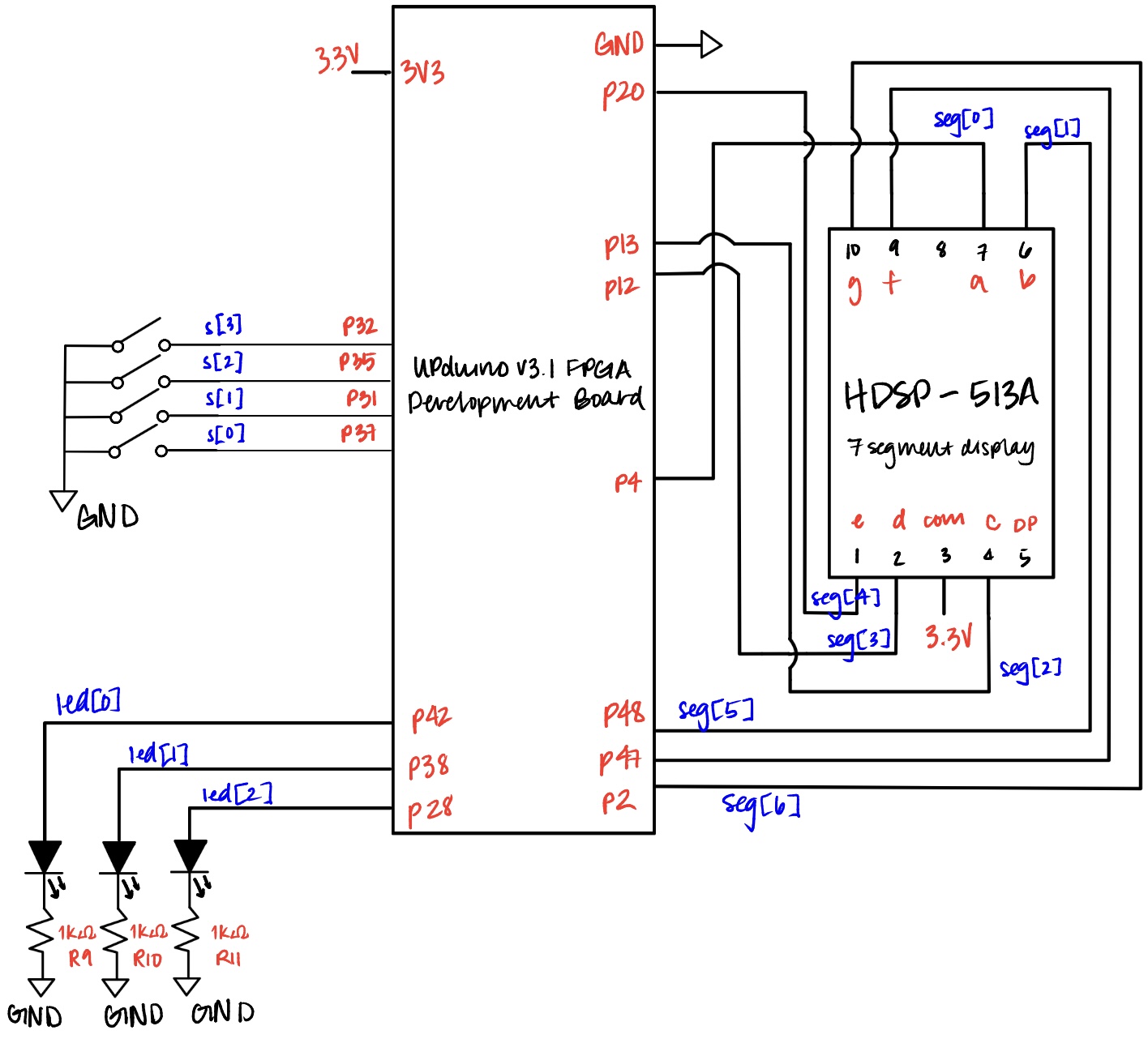 Figure 3: Schematic of the physical circuit of the FPGA, LEDs, switches and the 7-segment display.