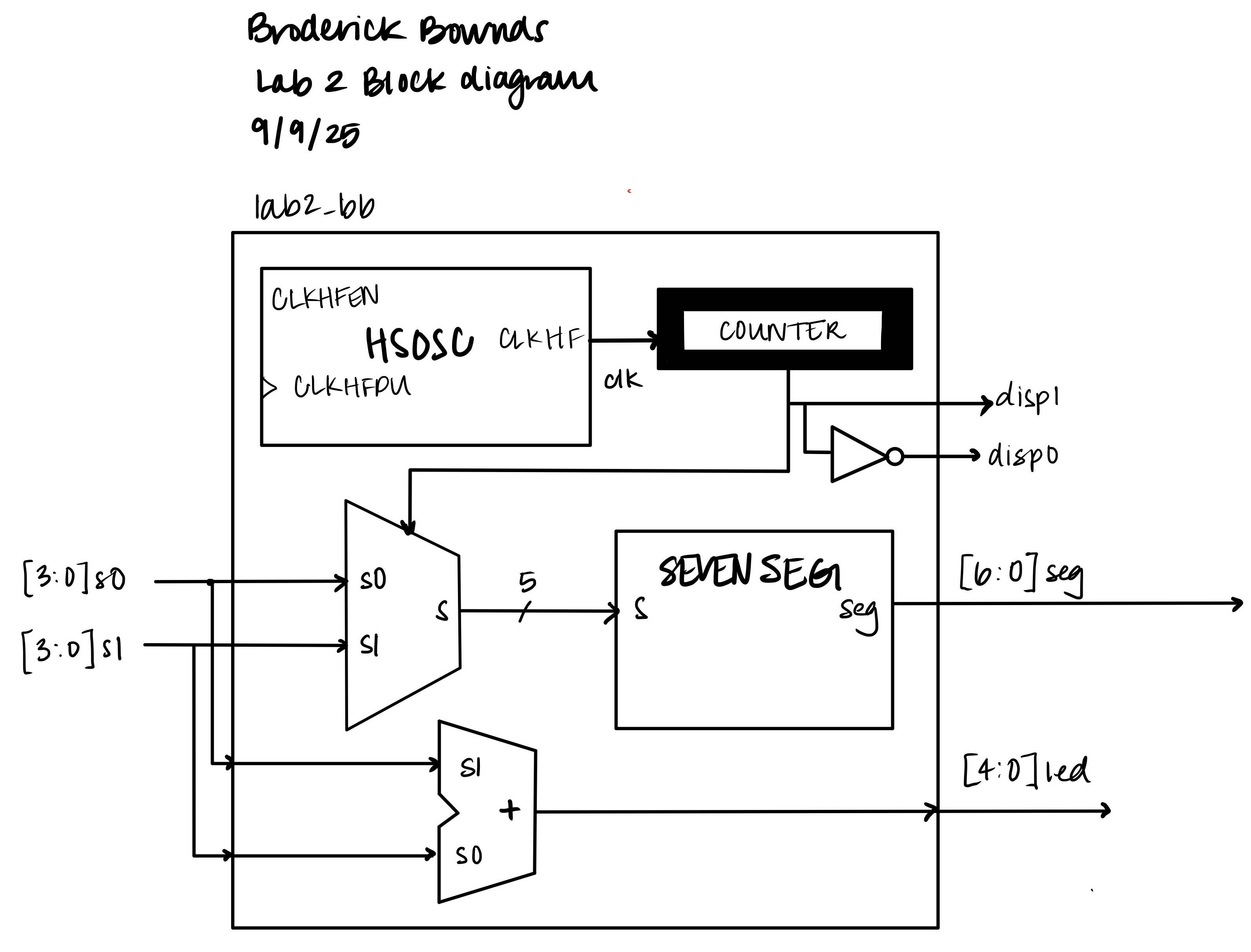 There is a top level module lab2_bb that instaniates the iCE40 oscillator and uses lab2_bbtb to verify simulation. The modules divides frequency using a 25-bit counter and have it “drive high” at the 19th bit (or when counter ==(2.^19)). This toggles a select signal select_mux to switch between the two hexadecimal inputs. Then it assigns the sum out (assign led = s0 + s1). Then control the digit enable signals disp0 and disp1 to ensure one display is high at a time. The sevenseg module is reused from Lab 1 and is a pure combinational decoder.