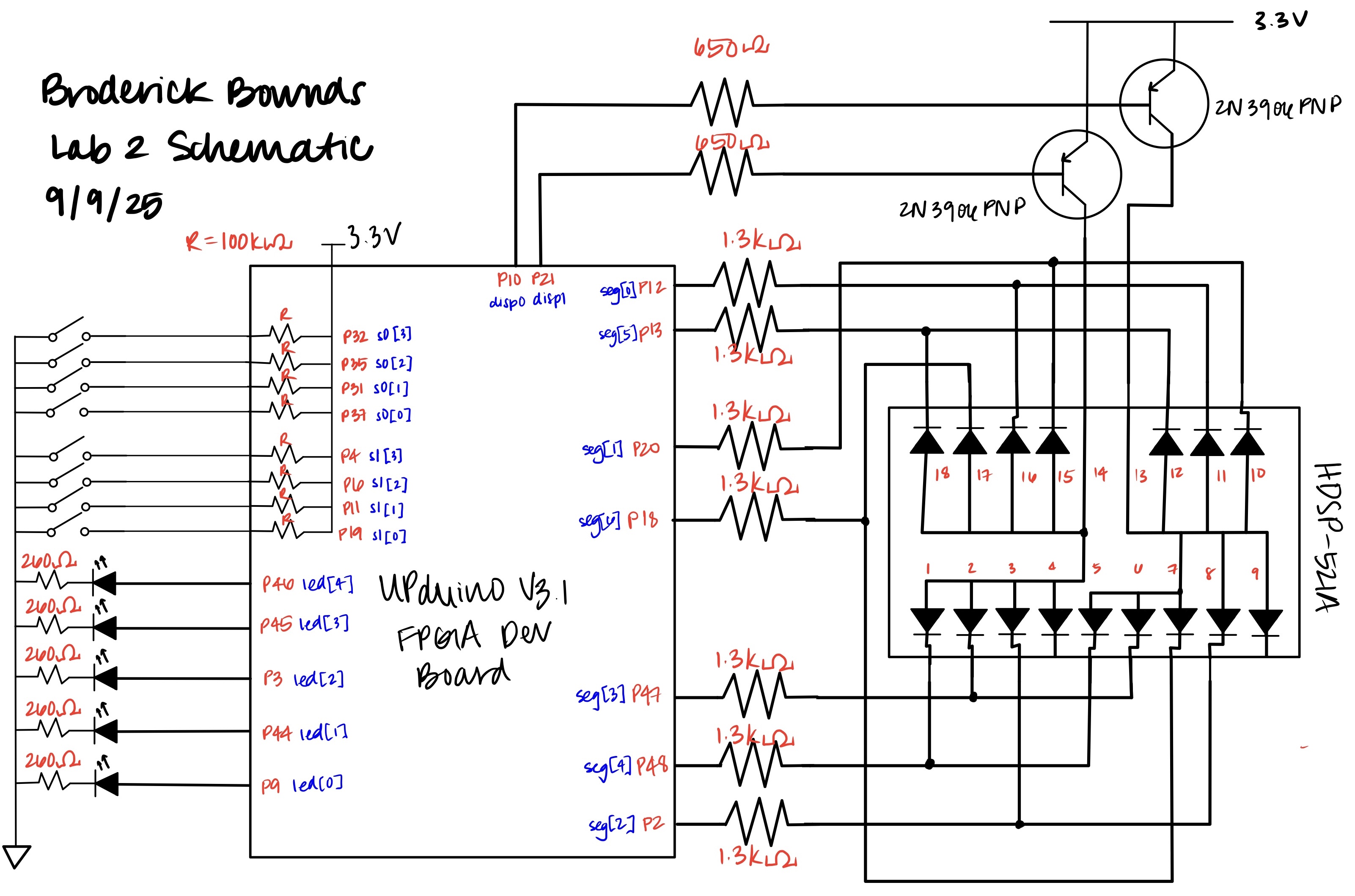 The FPGA design for this lab was constructed in a modular and hierarchical method to meet teh multiplexed display instructions. The top level module lab2_bb coordinated the system while sevenseg provided the specific functionality.