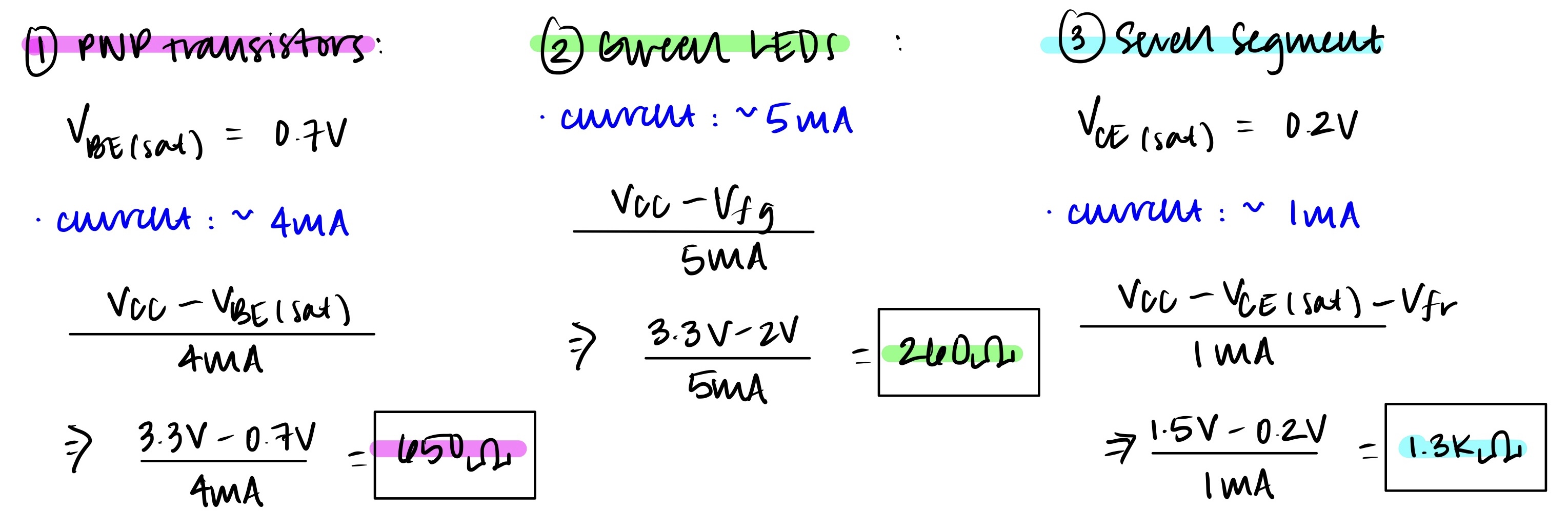 (1) PNP transistor: The transistor drives a lot of current and ensure that the FPGA pins were not sinking more than 8mA (our safety margin was 4mA). So thefore the base emitter saturation voltage (VBE(sat) = 0.7V). Taken into account then our resistor value is 650Ω.