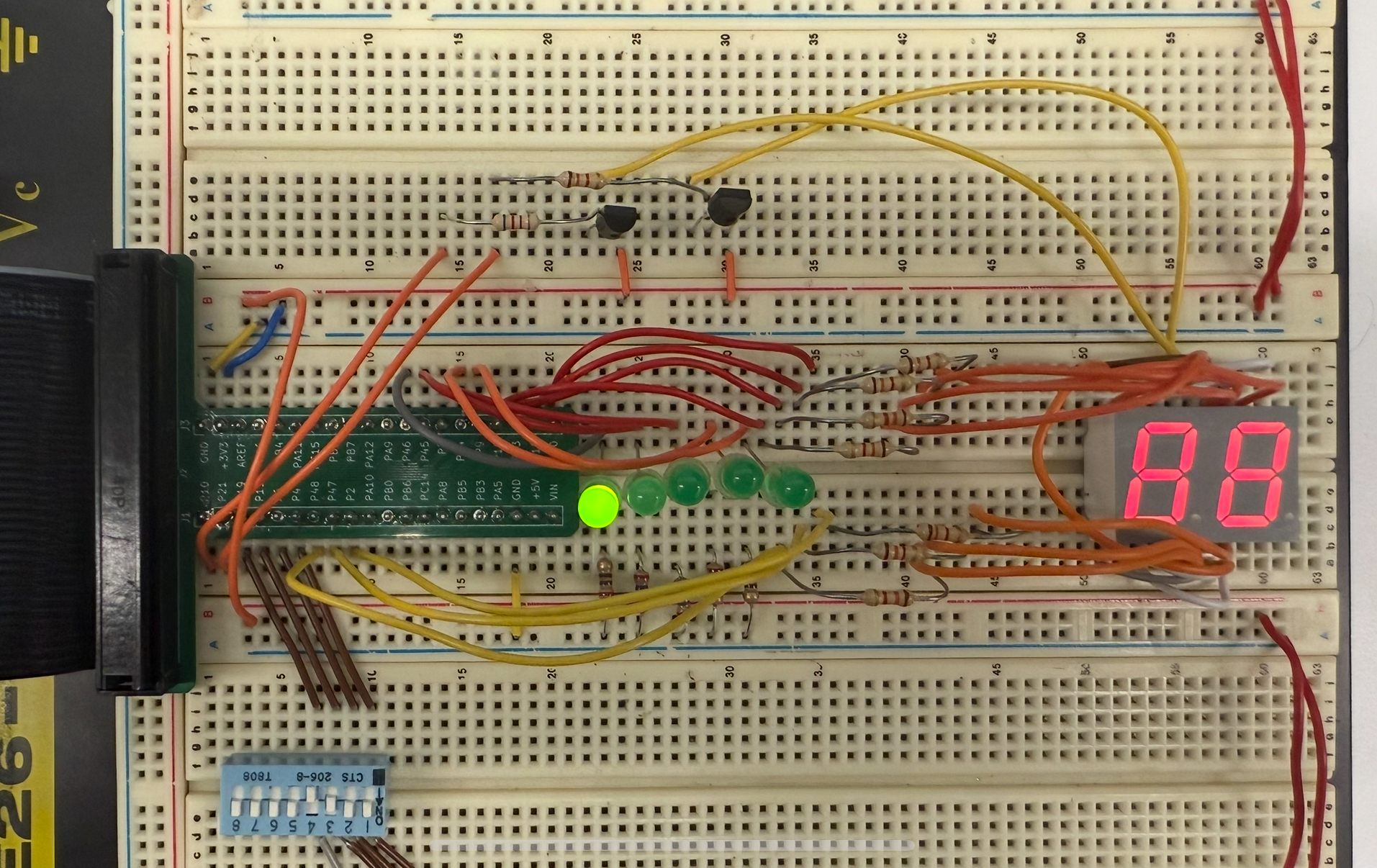 The outputs of the DIP swithes provided the two hexadecimal values (s0 and s1). These values are added and the (max number is 30, 5-bit wide) was displayed on five external LEDs. The seven segment require additonal transistor circuitry to handle the higher current of the common anode pins, since a FPGA pin cannot source the needed current (~8mA).