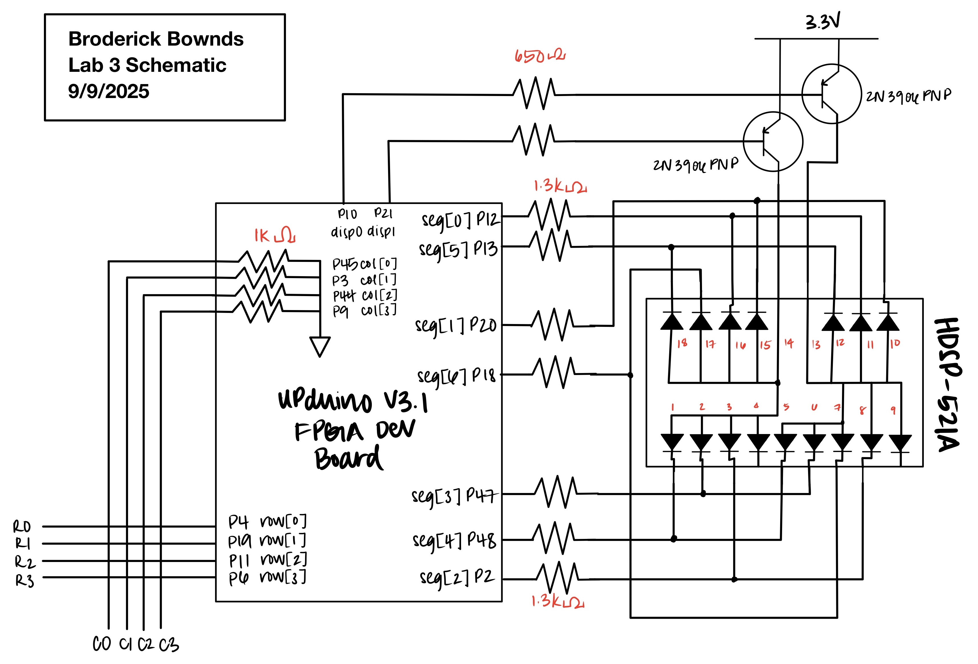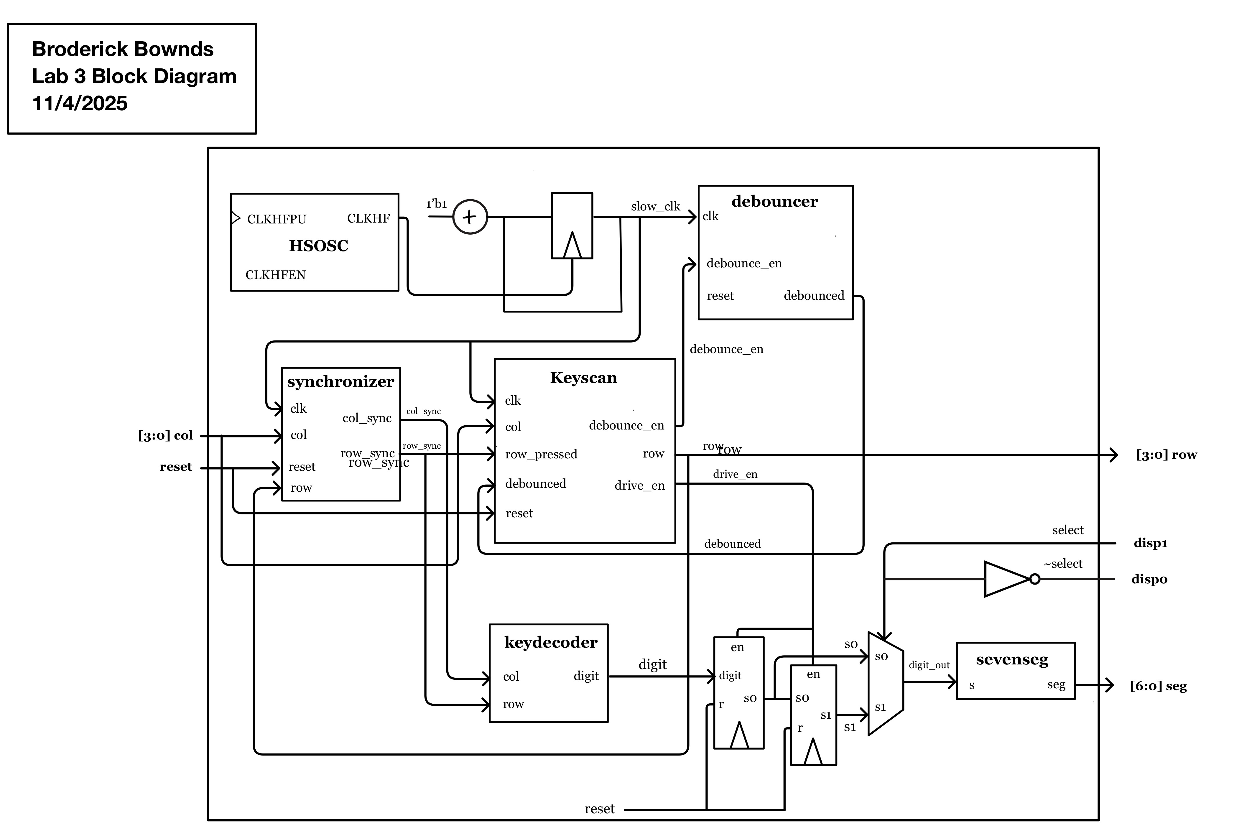 At the top level (lab3_bb.sv), the internal high-speed oscillator (HSOSC) provided a 24 MHz clock, which was divided down by a counter to a slow clock of approximately 240 Hz. This slower clock was used both for keypad scanning and seven-segment display multiplexing, ensuring stable visual output and eliminating flicker or “ghosting.”