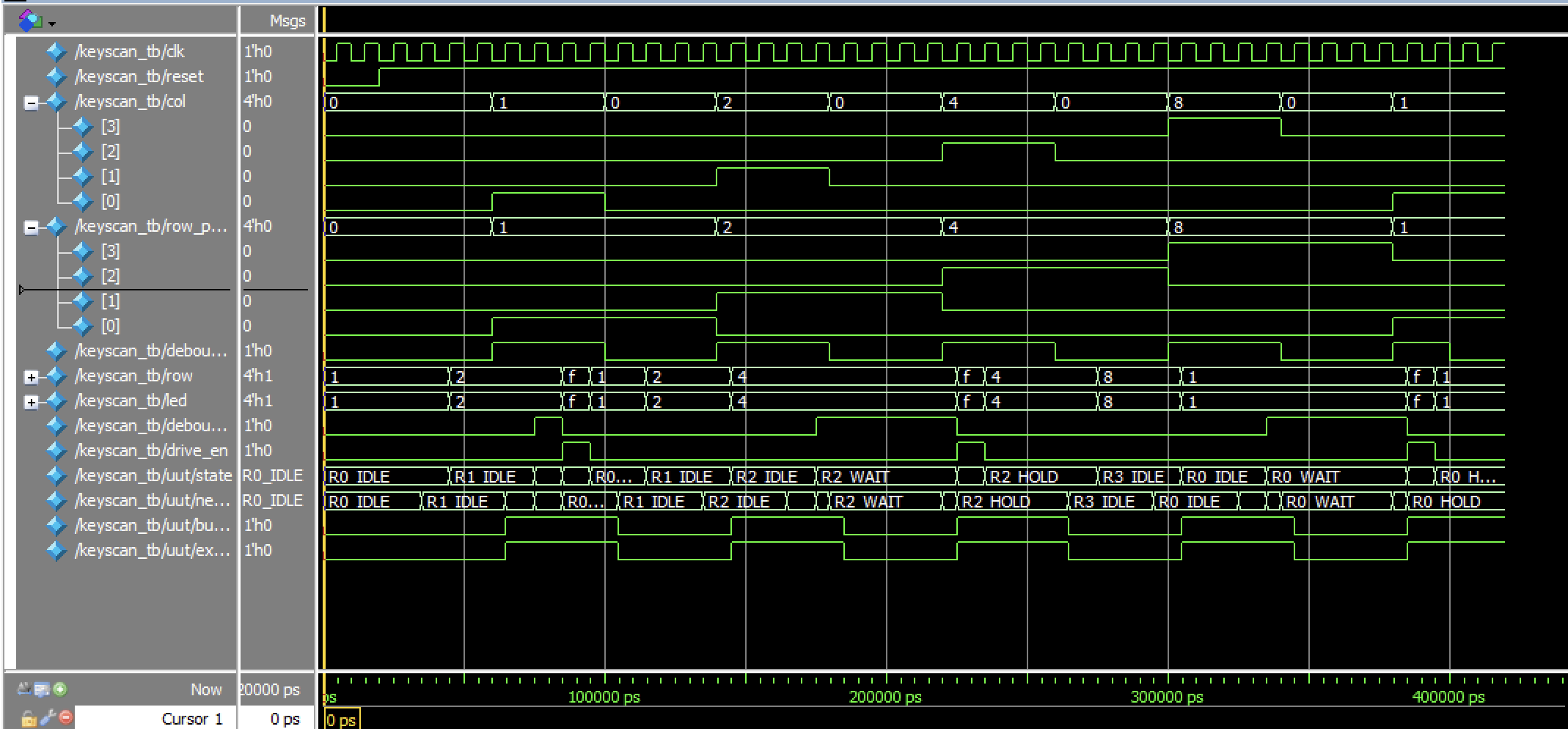 keyscan.sv module showcasing each input and output by powering columns and driving rows.Table 1: State transition table for the Keyscan FSM