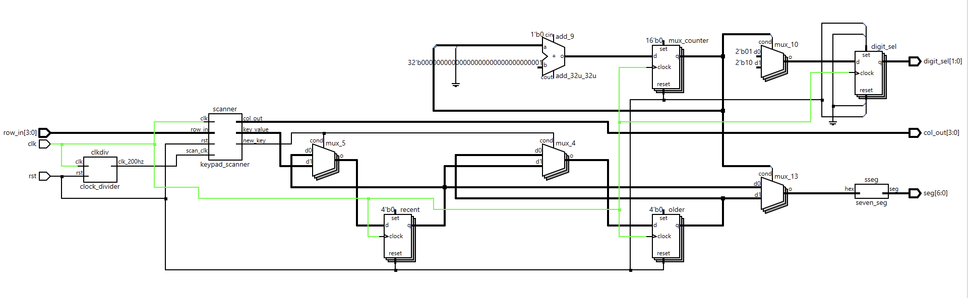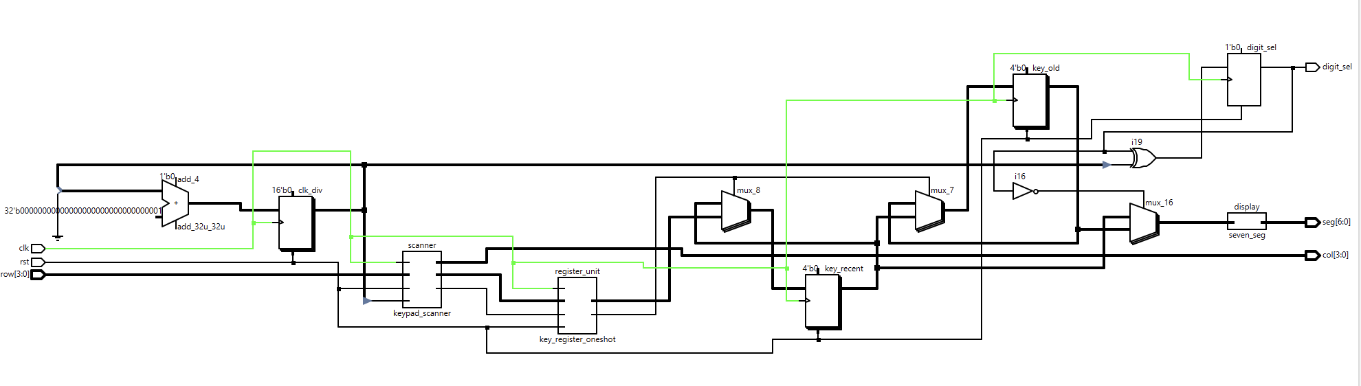 - A top-level module that updates two hex digits (older and most recent) when a new key is registered and drives a time-multiplexed display without flicker.