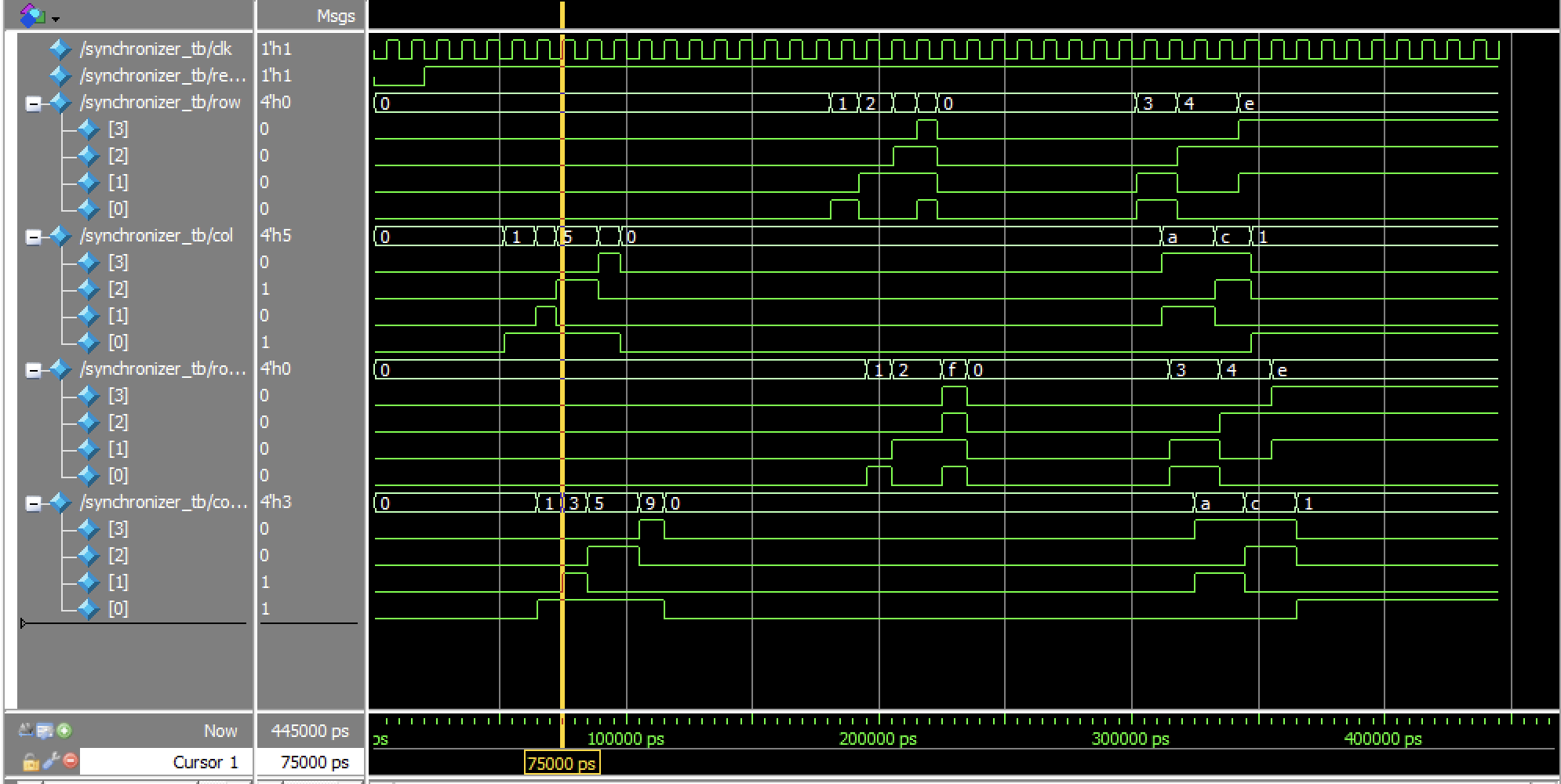 synchronizer.sv – Implements a two-stage flip-flop synchronizer to align asynchronous keypad inputs, rows and columns to row_sync and col_sync the system clock, preventing metastability.