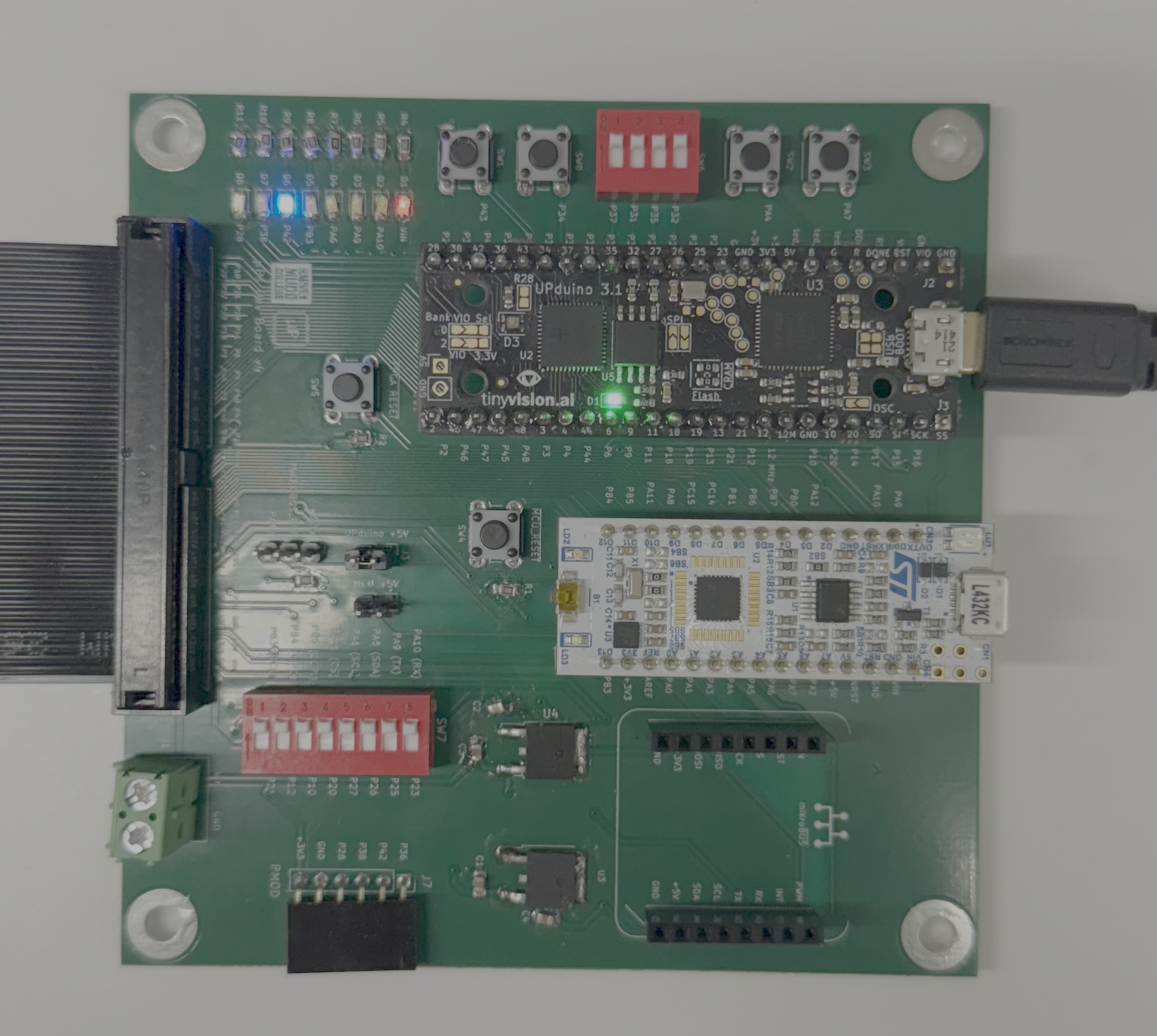 Figure 1: Shows the Microprocessor Development Board v.4 with the Upduino FPGA and MCU, along with pushbuttons and switches.